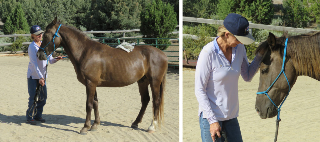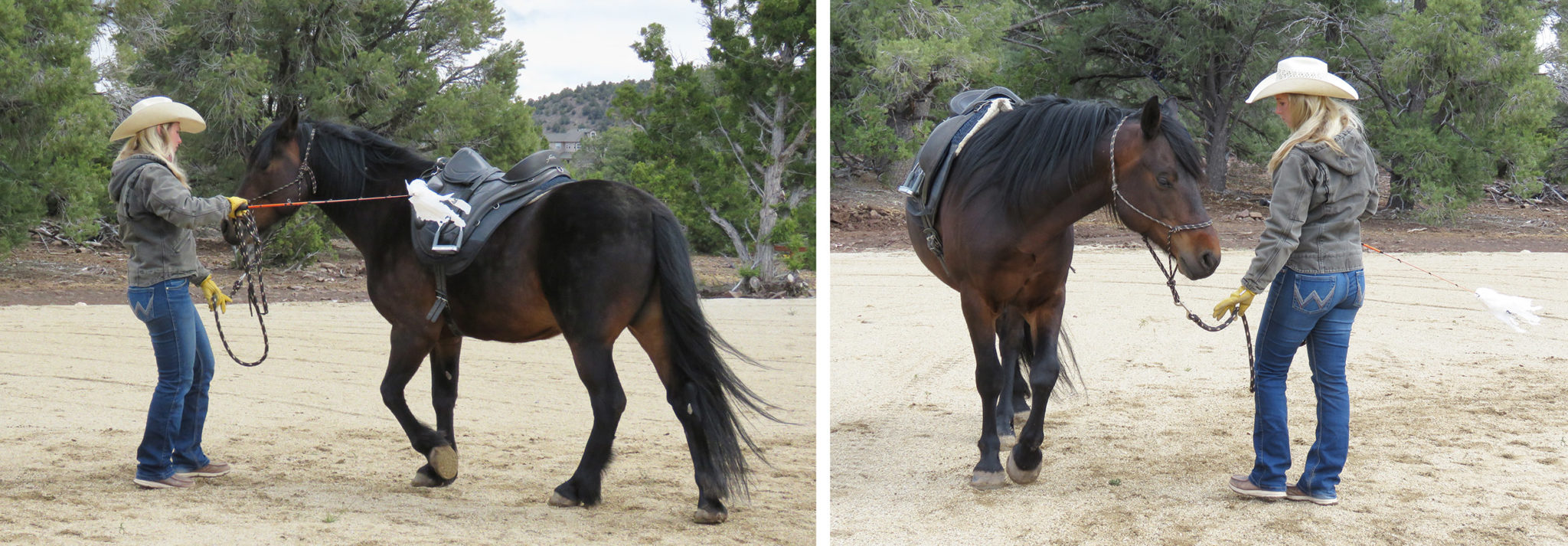 This young gelding had been traditionally sacked out before he came to student Cindy. Though Tonka would stand very still in response to pressures like the touch of the flag, his tense posture reflected his worry. In the photo on the left, Cindy uses the lead to ask Tonka to soften, which here means to turn off and release the defensive muscles of the back. When Tonka does soften (right), resulting in a lowered head and a more relaxed expression, Cindy releases the light pressure she had on the lead, removes the flag, and offers praise.