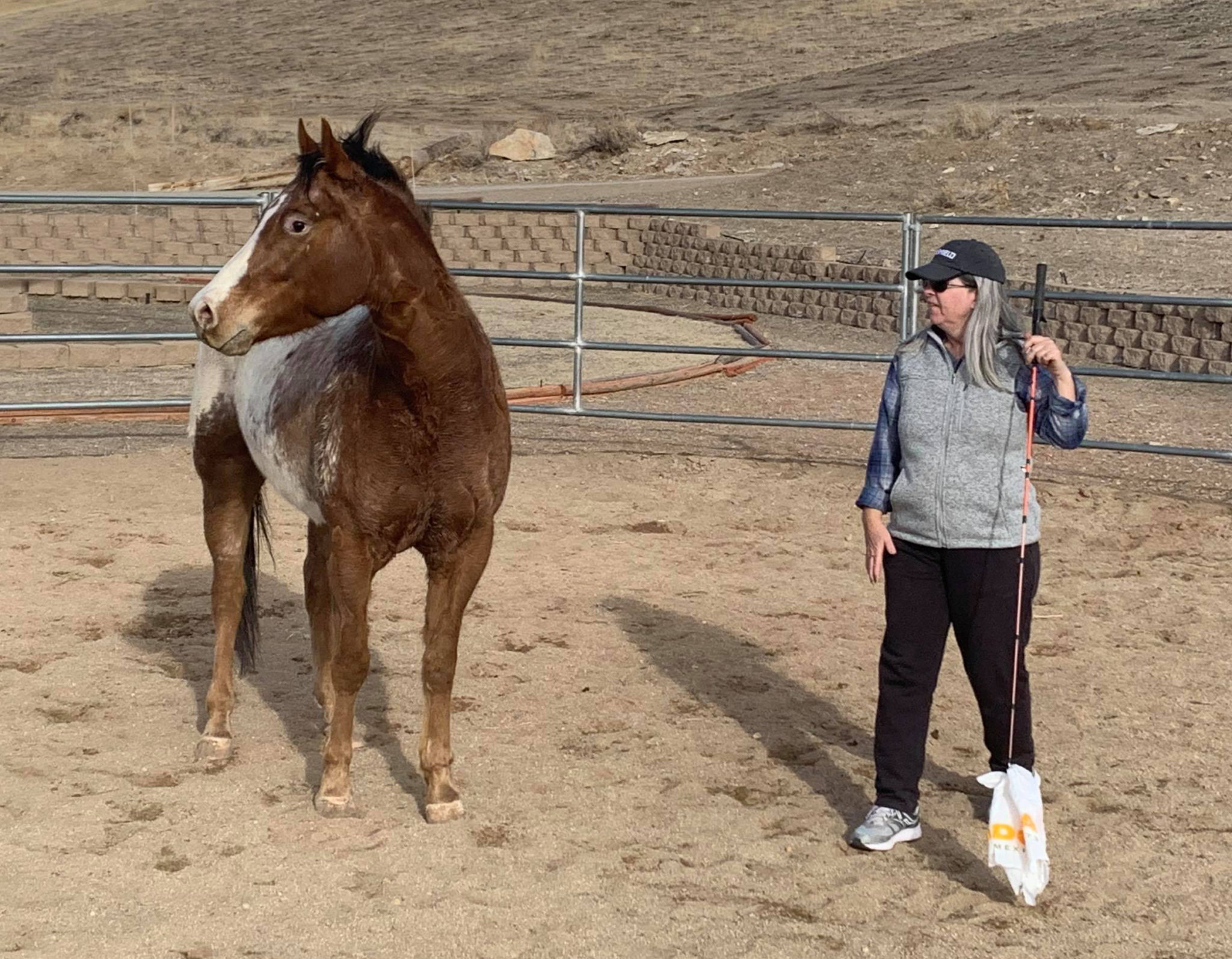 When the horse’s mind is strongly focused on something outside the pen, your first goal is to call the mind back into the pen. Here, my student tries slapping her thigh to see if that is enough to get this colt’s attention, but if it isn’t, she will shake her flag, playing with the intensity of pressure until she succeeds in getting a change.
