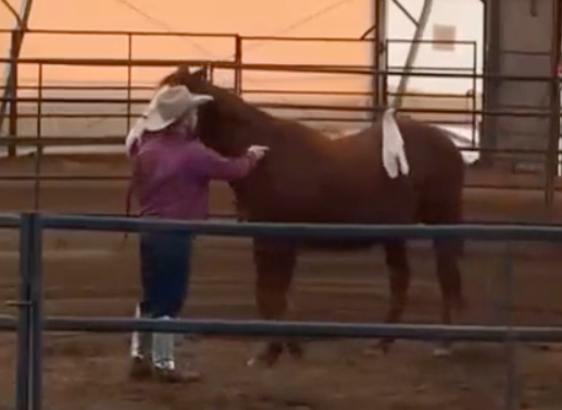 In Relational Horsemanship, touching the horse with the flag is not a way to “sack out” or “desensitize” the horse, but is a way to help him remember how to think through pressure and relax, rather than simply react and become braced in his body. (Video clip from webinar on “Bringing a Horse Back After Time Off”, available in our online program at JoshNichol.com)