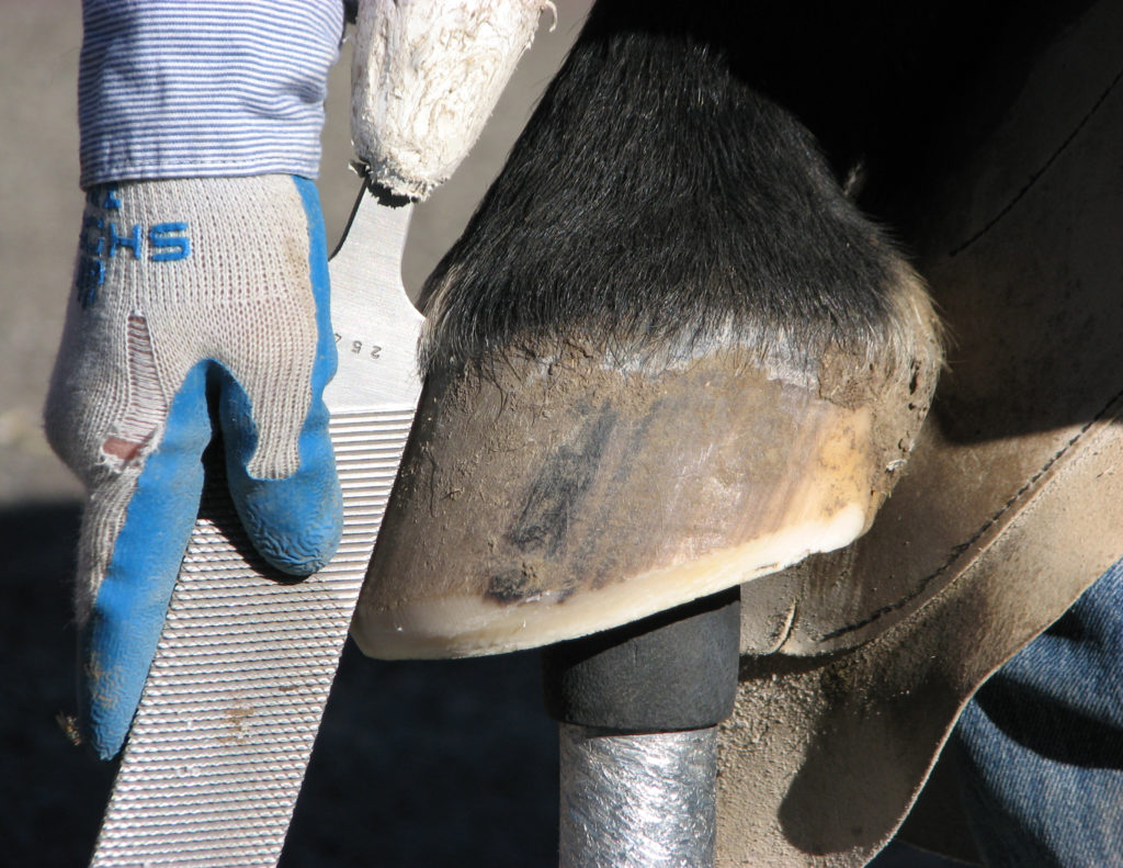 I do a lot of different activities with my horses, from arena training to trail riding to long days working cattle. My ability to do my job relies heavily on my horses, so I need to keep them as healthy and sound as possible, whatever we are doing. When it comes to hoof care, I have found that my horses are most likely to remain strong and able to work when they are maintained with physiologically correct barefoot trimming. This is not the same thing as what many people call a “pasture trim”. It requires specialized knowledge of how the equine hoof is meant to function, how to optimize hoof shape and balance to maximize function, and what to leave alone so that you don’t inadvertently keep a horse foot sore by “cleaning it up” too much with the hoof knife at every trim.